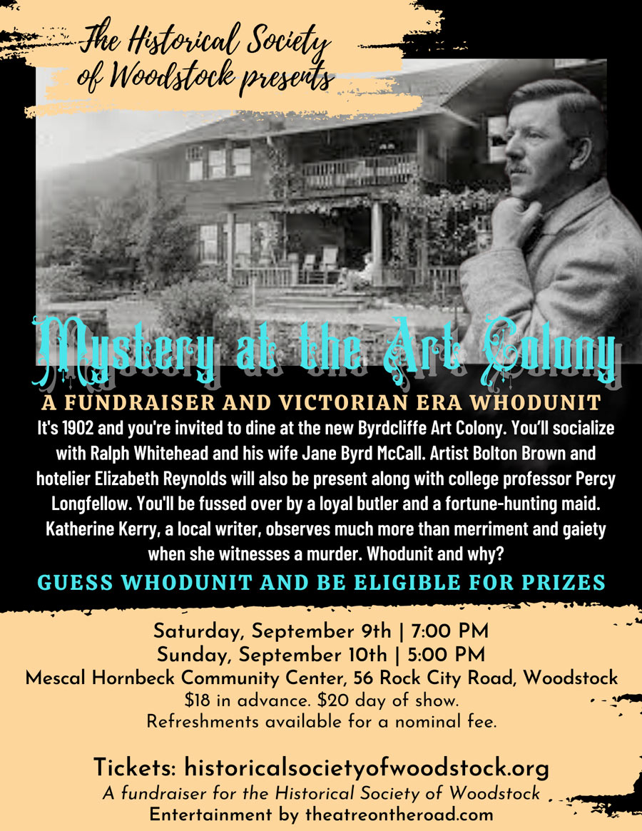 “Mystery at the Art Colony” will be performed as a fundraiser for the Historical Society of Woodstock, on Saturday, September 9 at 7:00 pm and Sunday, September 10 at 5:00 pm. Tickets are $18.00 in advance and $20.00 the day of the event. Light refreshments will be available for a nominal fee.